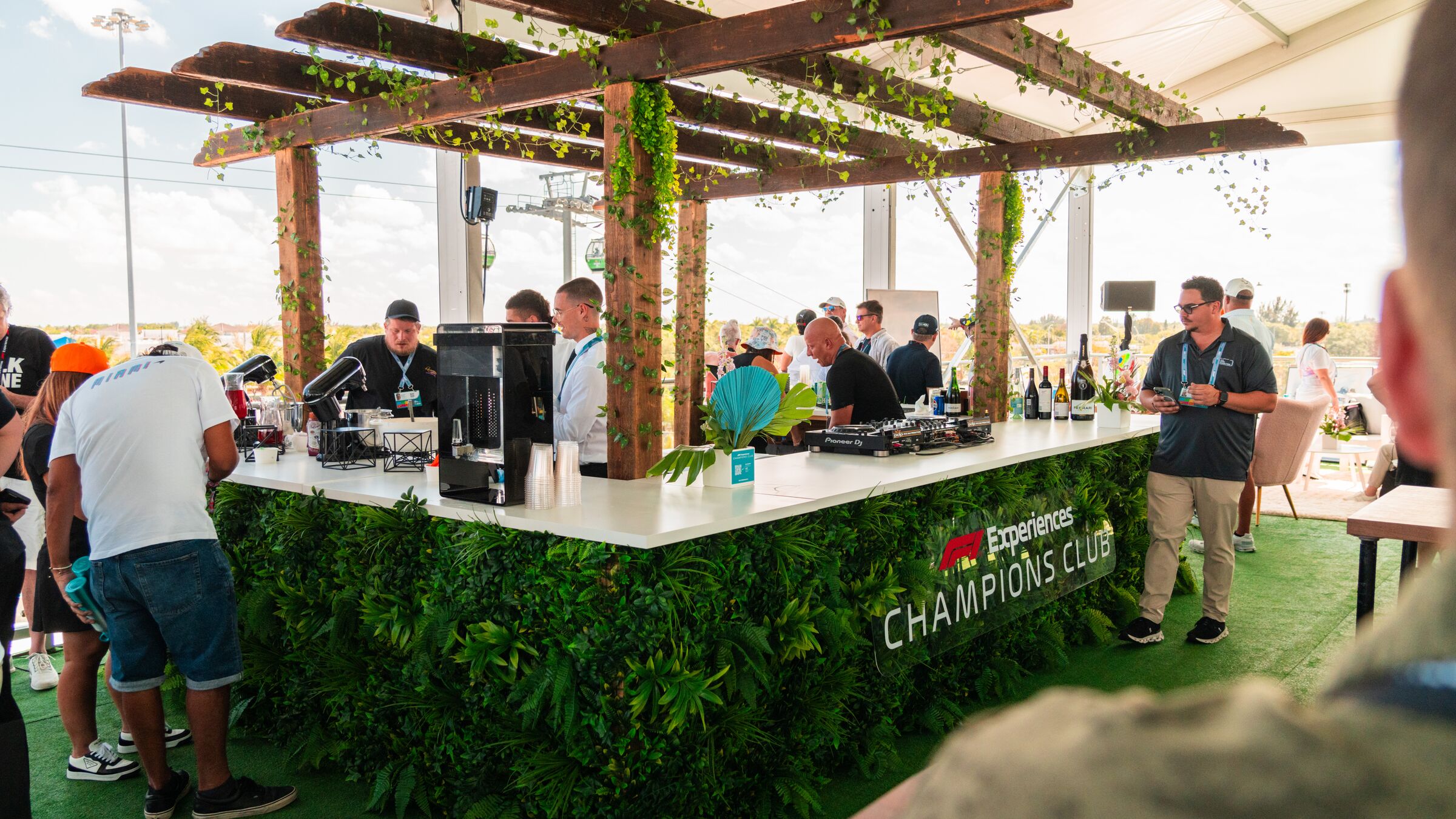 Take in all the action from our 3-story Champions Club venue, positioned in the Promenade inside the track at Turn 5 just past Hard Rock Stadium as the cars approach the Marina. Enjoy the enclosed, climate-controlled space on Levels 1 & 2, or step outside onto the covered, open-air rooftop with a fan on Level 3.